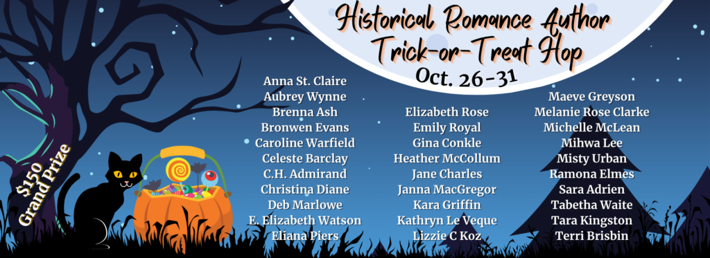 Join us for our annual Trick-or-Treat Hop full of Halloween fun! Hop to all 30 historical romance author sites for a chance to win a $150 Gift Card!